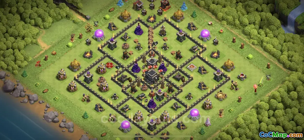 This TH9 base employs advanced defenses to counter air units, particularly dragons, which are often used in raids. The positioning of defenses such as air sweepers and archer towers is optimized to create a formidable barrier against aerial assaults. Additionally, the design ensures that essential buildings, such as the Clan Castle and the Town Hall itself, are well-protected. This configuration not only aims to reduce the likelihood of obtaining two stars but also to keep the overall damage to a minimum during attacks.