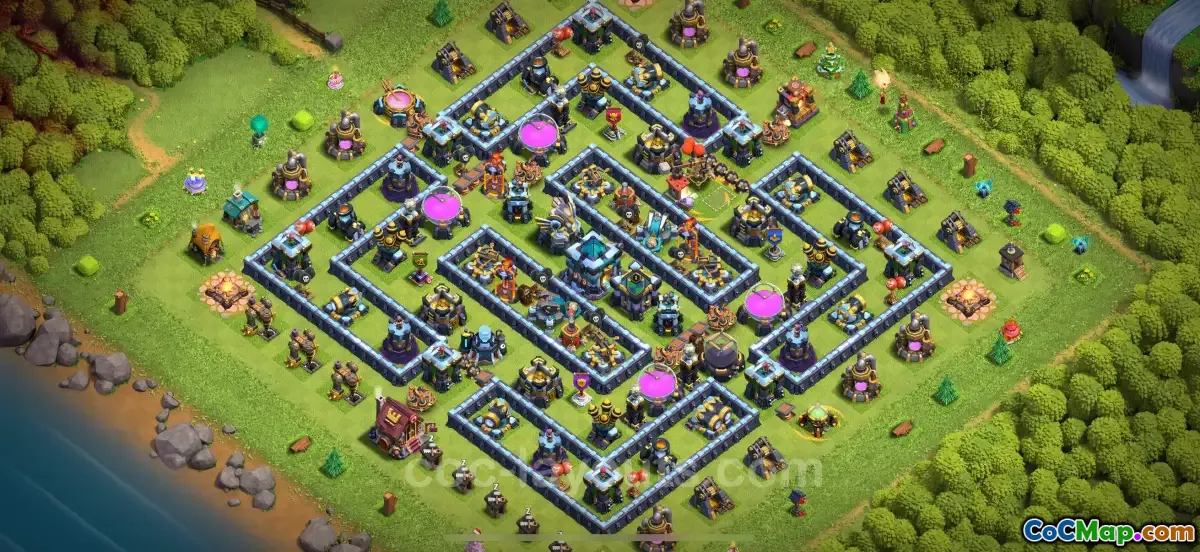 This top-tier Anti 3 Stars TH13 base layout offers a strong defensive setup that is optimized to withstand the most aggressive attacks from top Clash of Clans players. Its strategic placement of defenses, traps, and walls creates multiple layers of protection around the Town Hall and key resources, making it difficult for opponents to secure a three-star victory. The base's design emphasizes balanced defense coverage, enabling effective counterattacks against various attack strategies commonly used at the Town Hall 13 level.