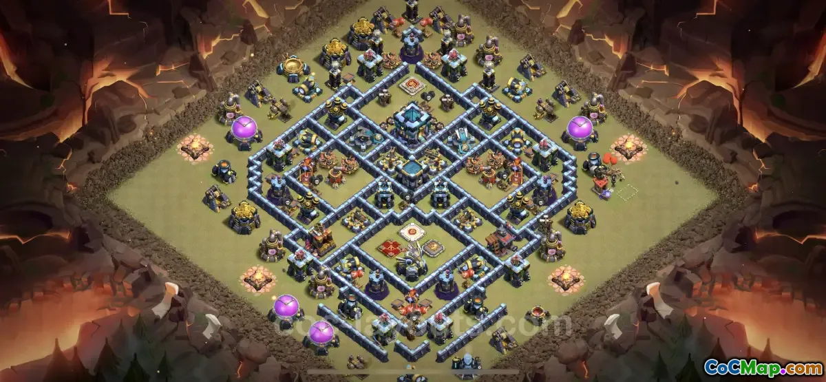 The Best Anti 3 Stars War Base for Town Hall Level 13 is designed specifically to withstand attacks during Clan War Leagues (CWL). This base is strategically built to counter multiple offense techniques, particularly those that utilize Electro Dragons, making it a top choice for players looking to protect their resources and trophies. The layout effectively limits the attackers’ ability to earn three stars, which is crucial in competitive Clan War scenarios.