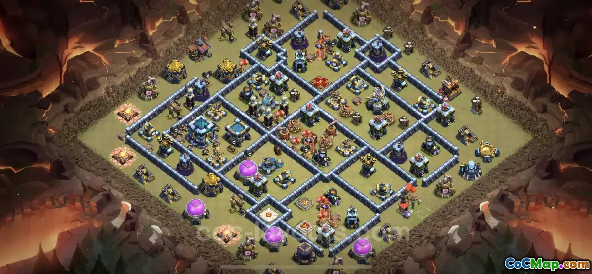 The Best War Base for Town Hall level 13 has been carefully designed to provide strong defenses against various types of attacks. This base layout is particularly effective for Clan War Leagues (CWL) as it incorporates features that make it challenging for opponents to penetrate. Its strategic design employs anti-everything tactics, meaning it is built to withstand different types of offensive strategies, whether they involve ground troops, air assaults, or a combination of both. Players can easily copy this base layout through a provided link, ensuring a competitive edge during wars.