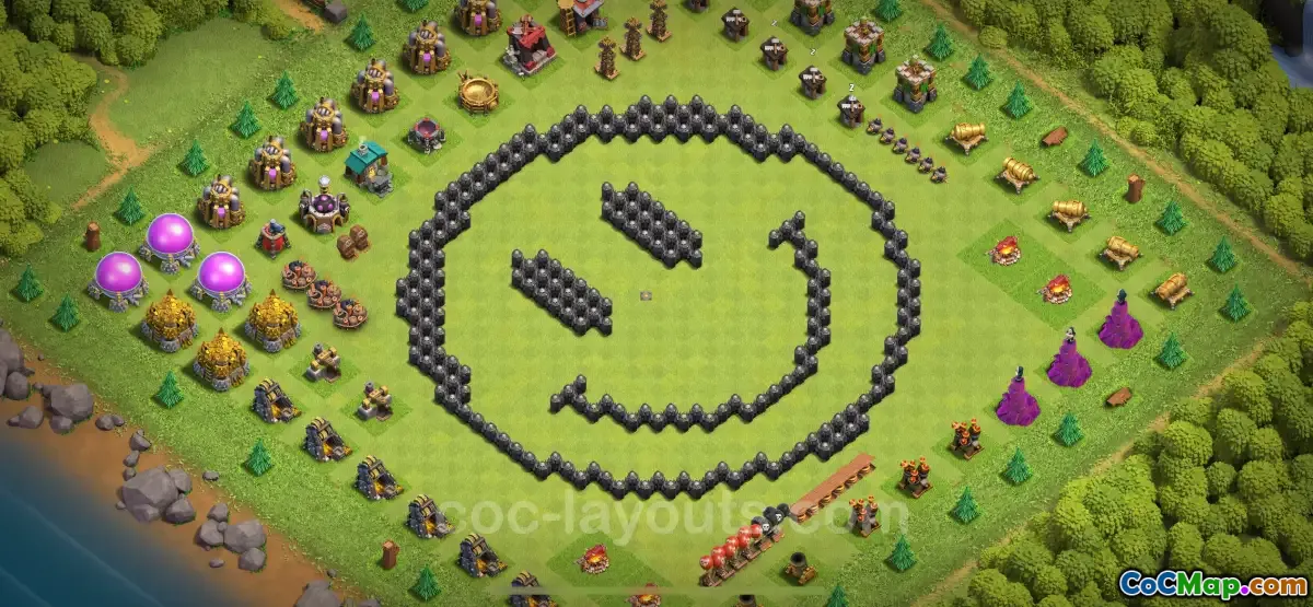Această bază amuzantă TH8 prezintă poziții inteligente și structuri înșelătoare care pot duce atacatorii în capcane sau își pot irosi resursele. Jucătorii care doresc să adopte această bază se pot aștepta să-și vadă adversarii frustrați în timp ce navighează pe aspect, care îi ascunde inteligent intențiile reale. Designul își propune să ofere un amestec de distracție și funcționalitate, menținând jocul plăcut.