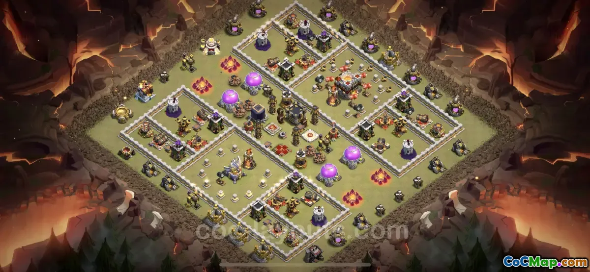 This top War TH11 base not only features an anti-everything strategy but also incorporates traps and defensive buildings in strategic positions to effectively confront attackers. Use of walls, placement of the Town Hall, and clustering of defenses all work together to create a formidable barrier. The layout promotes the dispersion of defenses, which can confuse and distract opponents, preventing them from executing their plans successfully.