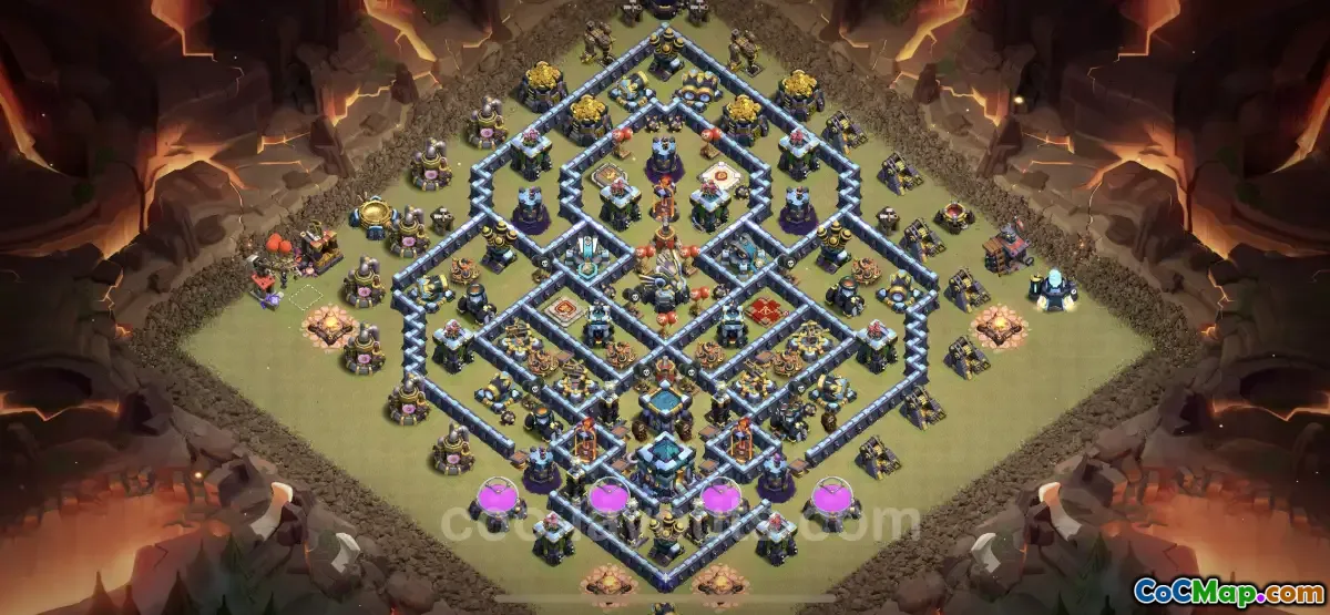This top-tier TH13 base showcases an "anti-everything" approach, meaning it aims to counter a wide range of attack types from ground troops to air raids. The layout is meticulously organized, featuring defensive structures such as defenses that target both air and ground. Strong walls and obstacle placements further bolster the defense, ensuring attackers must navigate a complex battlefield to reach the Town Hall. Players are encouraged to adopt these designs to enhance their defense strategy during CWL and other competitive gaming events.