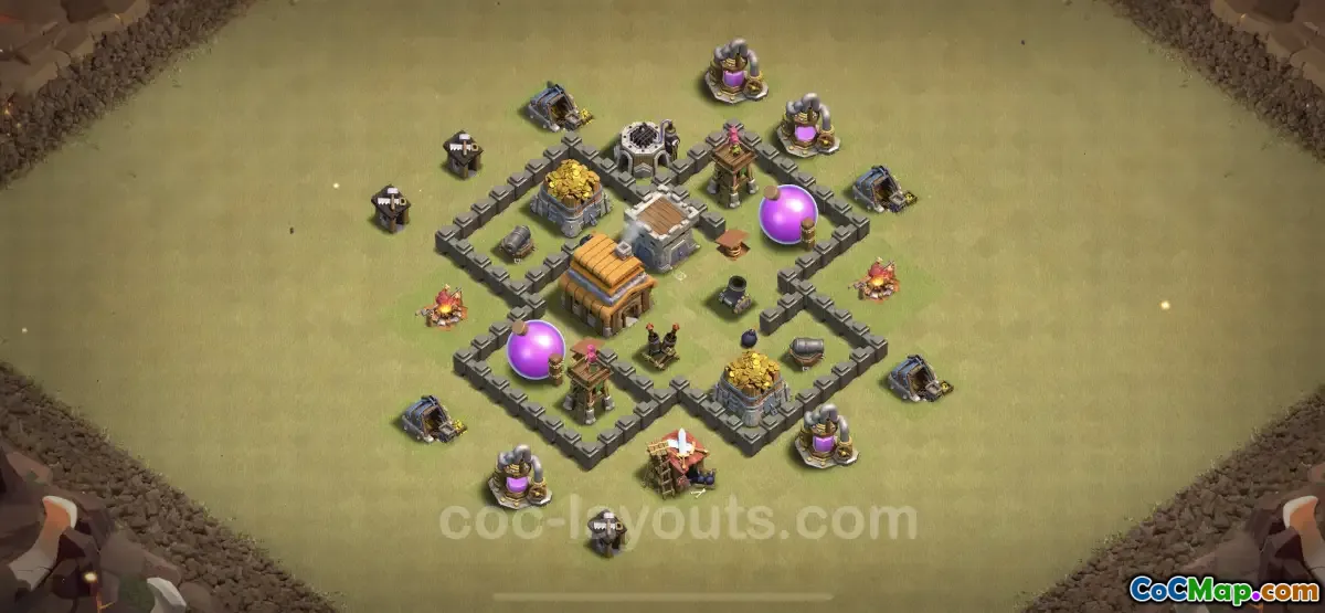 În rezumat, această bază TH4 este prezentată ca o structură defensivă bine gândită, potrivită pentru setările Războiului de clanuri din Clash of Clans. Utilizând o strategie de design hibrid, jucătorii își pot spori șansele de a respinge atacurile inamice, protejându-și în același timp resursele în mod eficient. Acest aspect exemplifică elementele esențiale care pot face sau distruge succesul unui jucător în timpul războiului competitiv în joc.
