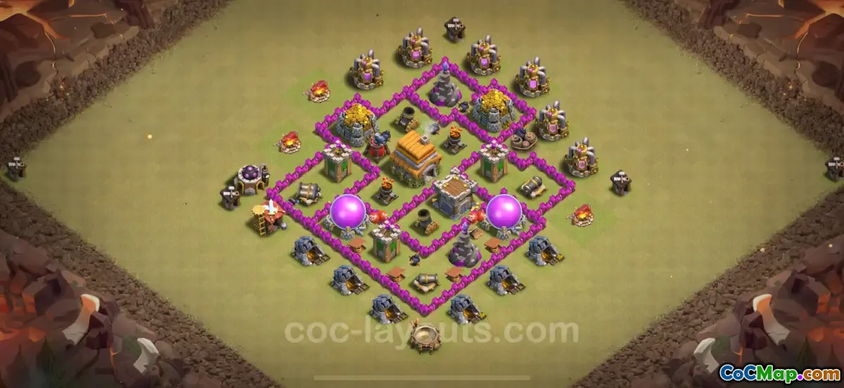Baza hibridă TH6 este special concepută pentru a oferi o apărare completă împotriva diferitelor strategii de atac, inclusiv atacuri terestre și aeriene. Această configurație de bază folosește plasarea strategică a apărării lângă ziduri pentru a crea straturi de protecție. Poziționarea centrală a Primăriei, împreună cu apărarea esențială, cum ar fi arcași, tunuri și mortiere, asigură că atacatorii se confruntă cu provocări multiple chiar de la începutul raidului.