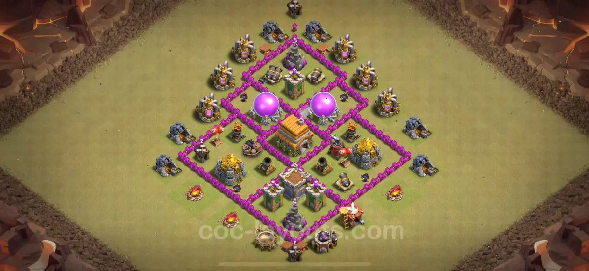 Una dintre caracteristicile cheie ale unei baze de război eficiente TH6 este un design „anti-totul”, ceea ce înseamnă că poate apăra o varietate de strategii de atac, inclusiv atacuri terestre și aeriene. Astfel de proiecte plasează de obicei bunuri valoroase, cum ar fi Castelul Clanului și depozitele, în mijlocul bazei, înconjurate de structuri defensive. Această poziționare centrală nu numai că protejează aceste resurse de a fi ușor accesibile, dar îi forțează și pe atacatori să cheltuiască mai multe trupe și timp, ceea ce este esențial în scenariile de război.