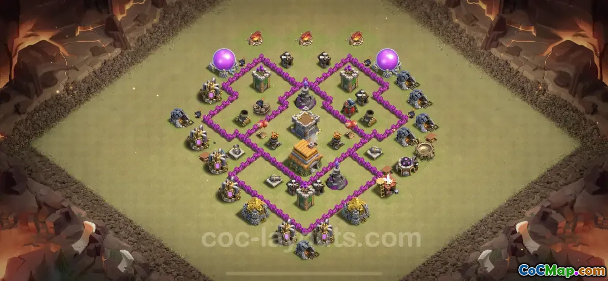 Designul de bază Town Hall 6 (TH6) pentru Clash of Clans este creat special pentru a oferi o apărare robustă în timpul războaielor și provocărilor. Este denumită o bază „Anti Everything”, ceea ce înseamnă că este construită strategic pentru a se apăra împotriva diferitelor tipuri de atacuri. Acest aspect de bază a câștigat popularitate în rândul jucătorilor care doresc să-și îmbunătățească capacitățile defensive și să își protejeze resursele în mod eficient în timpul Ligilor de Război de Clan (CWL).