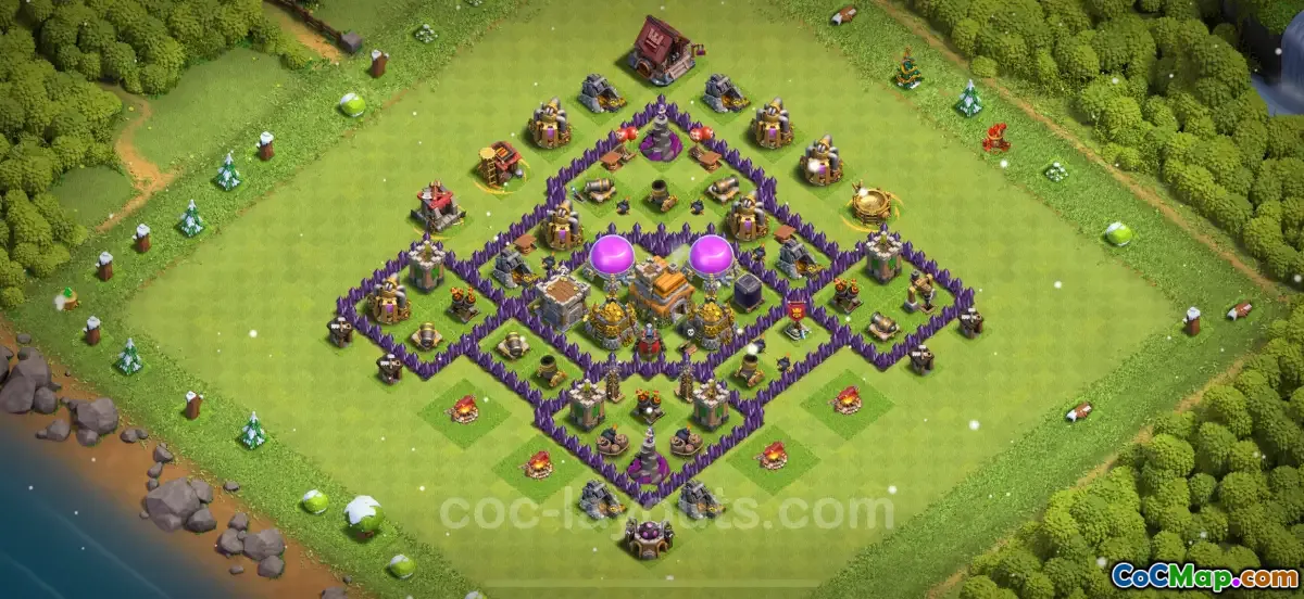 Dispunerea ideală TH7 combină amplasarea strategică a apărării și depozitele de resurse. Jucătorii adoptă adesea abordarea „anti-totul”, ceea ce înseamnă proiectarea unei baze care poate rezista mai multor tipuri de atacuri. Acest aspect include de obicei depozite centralizate de resurse protejate de ziduri și un amestec de clădiri defensive poziționate pentru a acoperi toate unghiurile de atac, asigurând că orice trupă invadatoare se confruntă cu o apărare formidabilă.