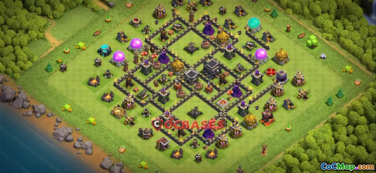 A Town Hall 9 trophy base in Clash of Clans is designed specifically to help players maximize their defensive capabilities while accumulating trophies. This type of base is structured to prevent opponents from easily accessing the Town Hall and key resources, thereby reducing the risk of losing trophies after an attack. The layout is typically asymmetric, strategically placing defenses and structures to create weak points that are not immediately obvious to attackers.
