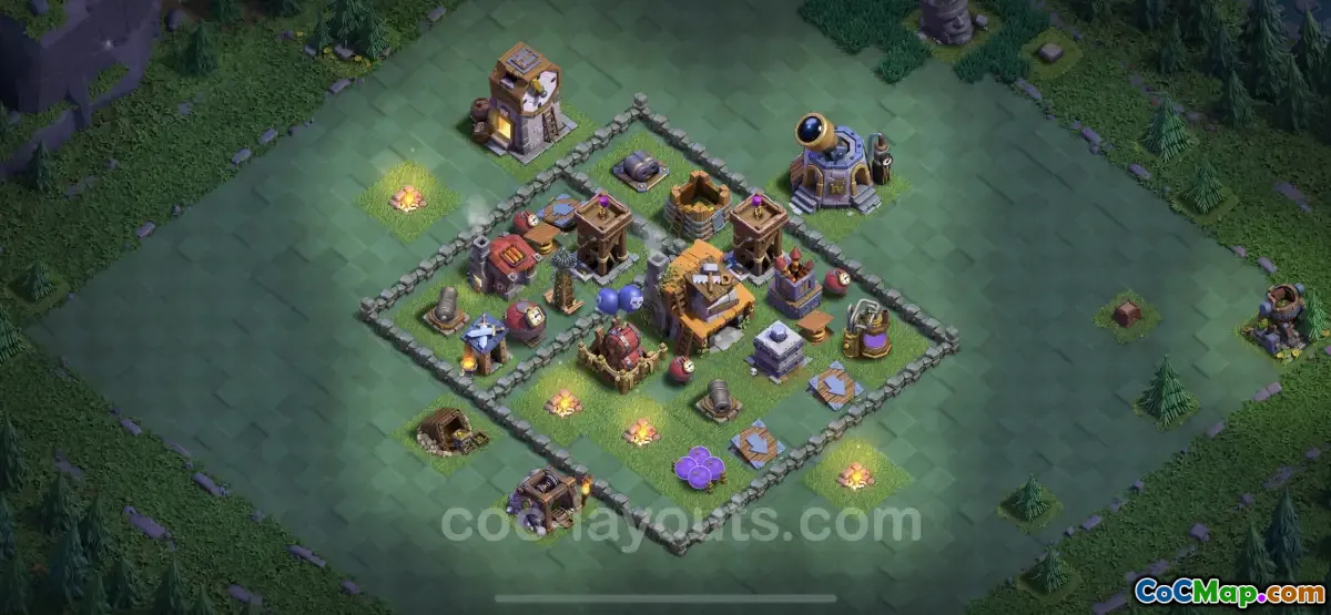 „Best Builder Anti Everything Base Level 4 Copy Design 2023” pentru Clash of Clans este un aspect de bază conceput strategic, menit să protejeze resursele și să minimizeze daunele în timpul atacurilor. Aspectul este adaptat special pentru Sala constructorului Nivelul 4, o etapă din joc care necesită o aranjare atentă a apărării și clădirilor pentru a rezista la diferite forme de atacuri inamice. Încorporând o configurație defensivă puternică, jucătorii își pot păstra resursele câștigate cu greu și își pot asigura mai eficient trofeele de constructor.