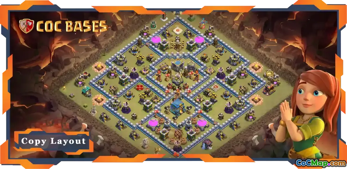 Acest aspect al bazei Primăriei 12 se concentrează pe o abordare hibridă, combinând măsuri defensive puternice cu capacitatea de a genera resurse. Designul este conceput în special pentru a rezista diferitelor strategii de atac, permițându-i să reziste la o mare varietate de amenințări din joc. Aspectul își propune să ofere o provocare grea atacatorilor, forțându-i să se gândească cu atenție la abordarea lor.