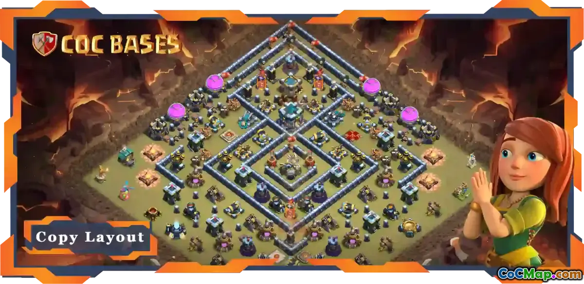 One key feature of this TH13 layout is its centralized Town Hall. Placing the Town Hall in the middle of the base makes it more difficult for attackers to reach it, especially if they are using ground troops. This central positioning also allows for better protection of the surrounding defenses, creating a synergistic effect that enhances the overall defensive capability of the base. The design includes compartments that force attackers to use more troops or time to break through, thereby increasing the likelihood of thwarting their offensive plans.