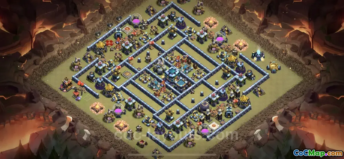 The Town Hall 13 (TH13) war base setup is designed to be highly effective in the competitive environment of Clash of Clans, particularly in the Legend League and Clan War Leagues (CWL). This base is specifically tailored to withstand attacks, especially from enemies employing Electro Dragons, making it a strategic choice for players who frequently face this type of offense. The base layout incorporates strong defensive structures and traps, enabling it to defend well against various attack strategies that players might utilize in high-stakes battles.