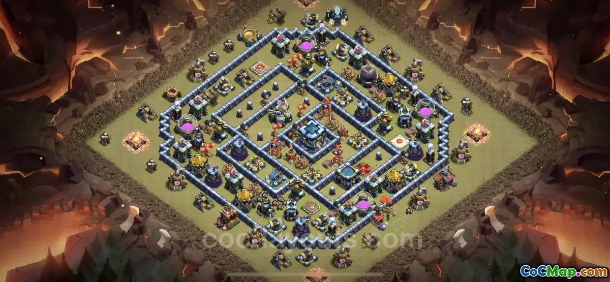 The Best War Base for Town Hall 13 (TH13) is designed to effectively counter three-star attacks while providing robust defenses against air assaults, including those launched by Electro Dragons. This base layout is specifically crafted to optimize the placement of defenses and traps, ensuring that it can withstand various attack strategies that opponents might employ during Clan Wars. These designs are shared with direct links which allow players to easily copy the base layout to implement it in their own game.