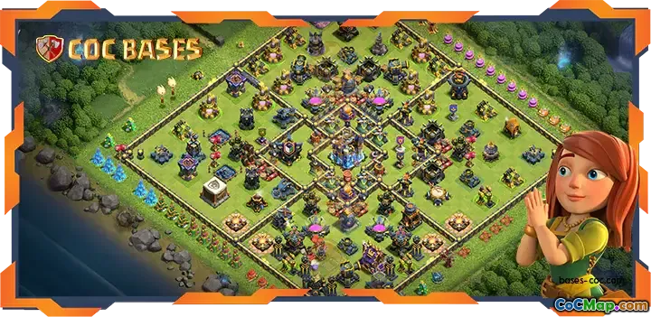 This top TH18 farming base layout offers robust protection against enemy raids, making it ideal for maximizing resource gains while minimizing the risk of 3-star attacks. Its strategic placement of defenses, walls, and traps creates a strong fortress that confuses and overwhelms attackers, especially in farming-focused battles.