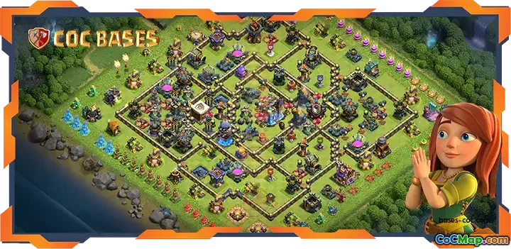 This top TH18 farming base features a carefully crafted hybrid layout that balances resource protection with robust defenses. Designed to withstand aggressive attacks, it employs strategic placement of walls, traps, and defensive buildings to disorient attacking troops and minimize resource loss. The base's unique design actively discourages 3-star strategies, making it ideal for farming and trophy protection.