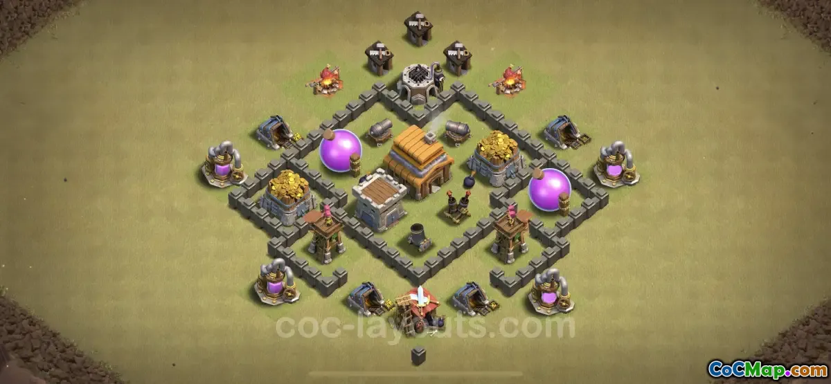 „Top Anti 2 Stars War TH4 Base” este un aspect strategic conceput pentru Primăria nivelul 4 din Clash of Clans. Scopul său principal este de a apăra eficient împotriva atacurilor, în special în timpul Ligilor de Război de Clan (CWL). Acest design de bază urmărește să minimizeze riscul ca adversarii să câștige două stele, ceea ce este crucial pentru menținerea unui avantaj competitiv în războaie.