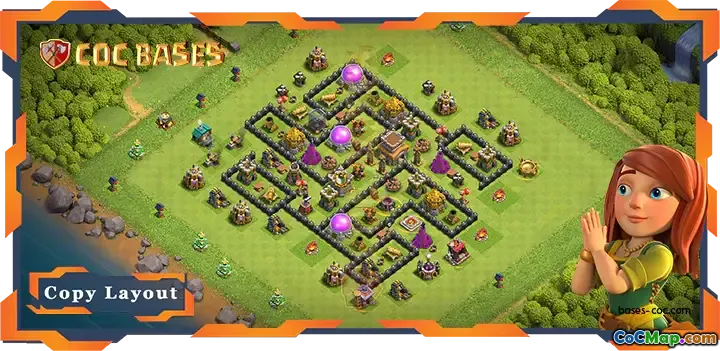 The Anti Trophy Base for Town Hall level 8 in Clash of Clans is specifically designed to protect against various attacks while maintaining a strong defense system. A key feature of this layout is the strategic placement of the Town Hall, which is situated centrally within the base. This positioning makes it more challenging for attackers to reach and destroy, thus creating a solid defense against trophy loss.