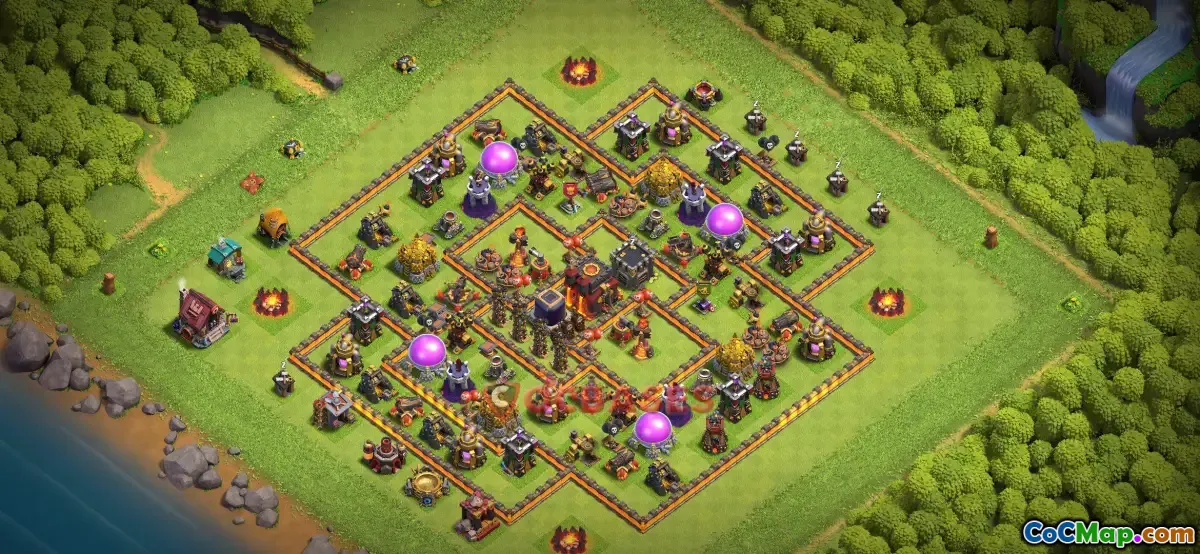 One of the main highlights of this farming base is its strategic placement of defenses such as Archer Towers, Cannons, and Tesla Towers, which work together to defend against common attacking strategies used at Town Hall 10. The base's layout often incorporates walls and traps like Bombs and Spring Traps to surprise and weaken attacking troops, thereby increasing the chances of successful defense and resource preservation.