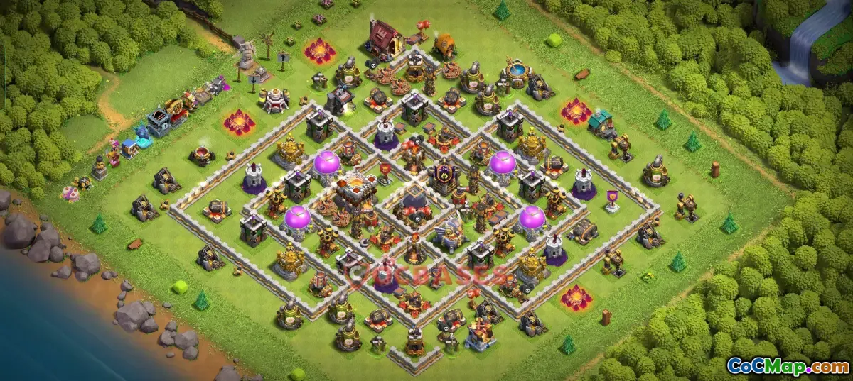 This Town Hall 11 trophy base design is specifically crafted to strengthen your defenses and protect your trophies in Clash of Clans. It is considered a highly effective 3-star anti-Township 11 layout, meaning it is built to withstand and repel even the most powerful attacks from opponents aiming for a complete destruction. The design focuses on strategically placing defenses and traps to maximize protection, making it a reliable choice for clan wars and defending your resources.