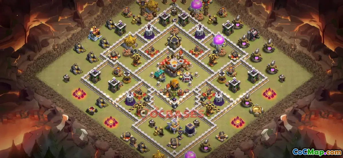 The Town Hall 11 war base in Clash of Clans is a strategic layout designed to defend against attacking clans during war. It typically includes well-placed defenses, such as cannons, archer towers, and new defenses like Inferno Towers and Eagle Artillery, to protect the core of the base. The layout also incorporates walls arranged to slow down and funnel attacking troops, making it difficult for opponents to reach the Central Town Hall and loot valuable resources or achieve victory.