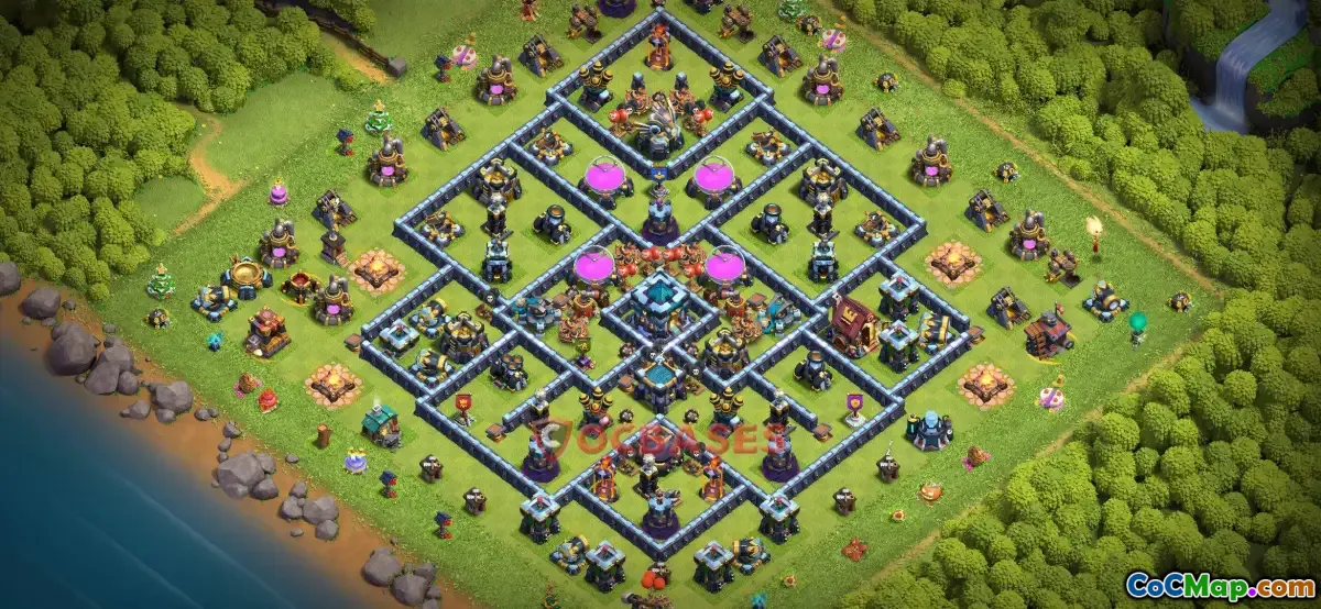 Farming bases at Town Hall 13 focus on creating a balanced layout that makes it difficult for attackers to reach the core of the base where the resources are stored. Common features include centralized storages, well-positioned traps, and effective placement of splash damage defenses to protect resource collectors and prevent quick raids. These bases often employ bait strategies, luring attackers into traps or defensive fire so that players can defend their resources successfully while still allowing for some farming efficiency.
