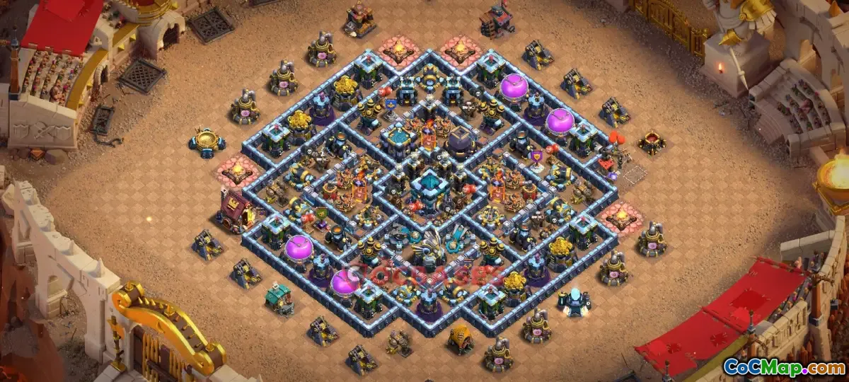 The Town Hall 13 hybrid base in Clash of Clans is a strategic design that combines elements of both farming and war layouts. It is built to protect resources while also being resilient against attacking strategies used in clan wars. This type of base layout typically features carefully placed defenses, storages, and walls to create a balanced defense that can handle a variety of attack tactics. The design aims to deceive attackers by hiding key defenses and making it difficult to reach the core of the base swiftly.