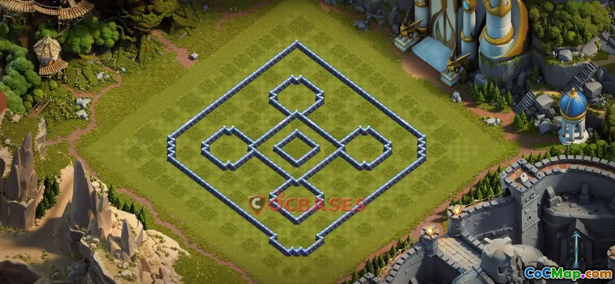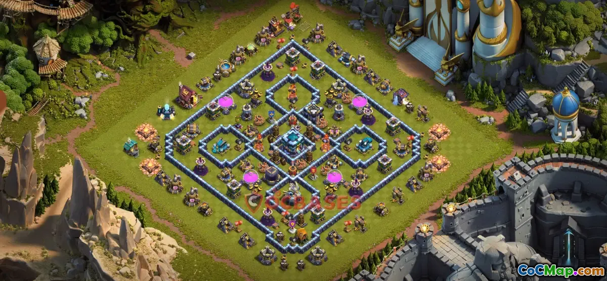 Strategic Town Hall 13 trophy base layout designed to maximize defenses and protect trophies. Easily copy this effective Clash of Clans defense setup for TH13.