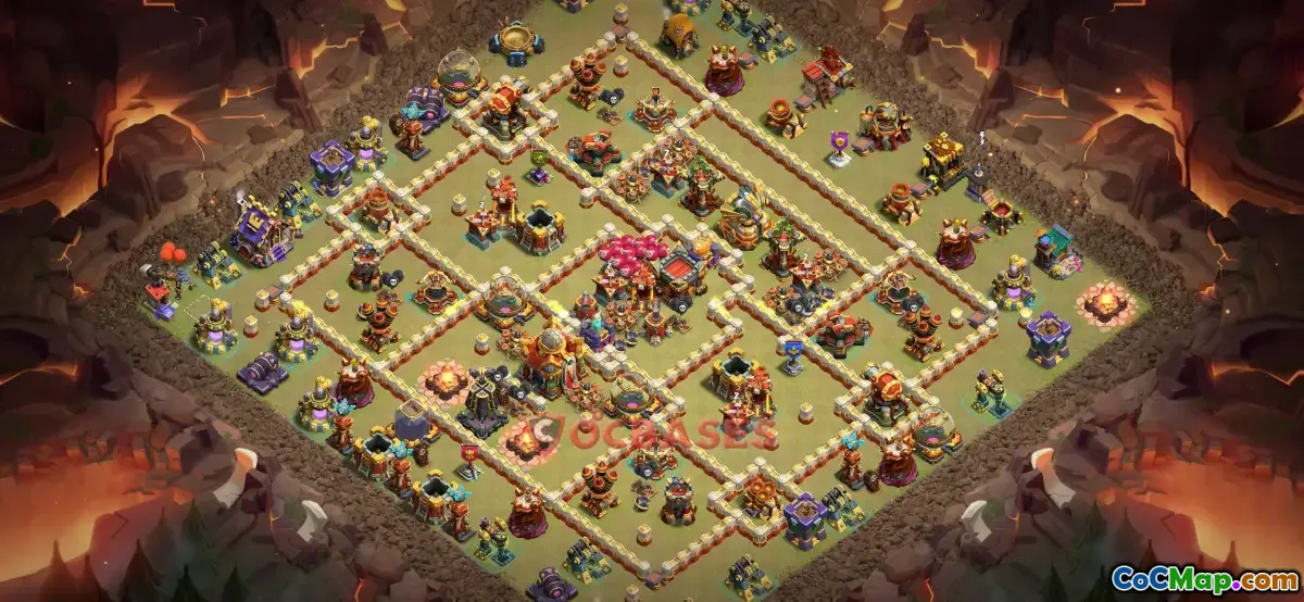 The Town Hall 16 war base in Clash of Clans is a strategic layout designed to defend against attacking players during war battles. This base setup emphasizes a strong central core, often housing key defensive structures and the Town Hall itself, which is well-protected by walls and other defensive buildings. The primary goal of this design is to prevent opponents from easily reaching and destroying the Town Hall, which is crucial for winning wars and earning stars. Effective placement of traps, hero positions, and Clan Castle can further enhance the base's defensive capabilities.