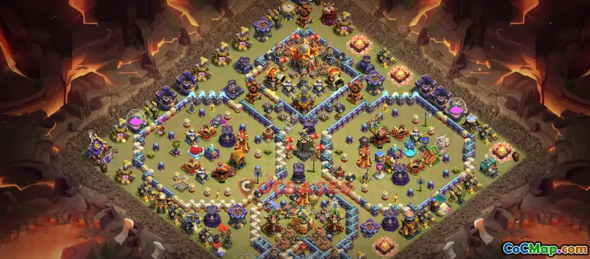 This Town Hall 16 war base is meticulously crafted to provide optimal defense against all attack strategies, making it a formidable fortress in Clan Wars. Its layout emphasizes anti-everything features, such as centralized Town Hall, well-placed traps, and layered walls, preventing enemies from reaching core assets easily. The base is specifically designed to counter common attack strategies like swarm, queen walk, and air assaults, ensuring your clan's defense remains solid.