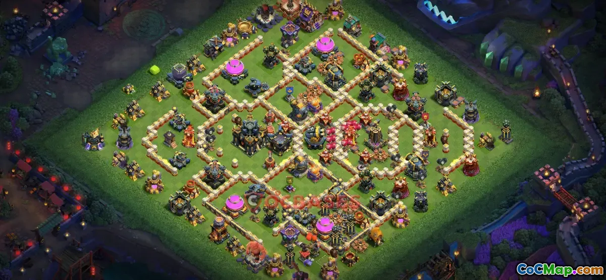 The Town Hall 17 farming base in Clash of Clans is specifically designed to maximize resource protection while minimizing the risk of losing valuable loot to attackers. This type of base layout typically features well-placed defenses, such as archer towers, cannons, and air defenses, strategically positioned around the resource storages. The layout aims to divert attacking troops away from the core resource buildings, making it harder for opponents to raid successfully and secure large amounts of resources.