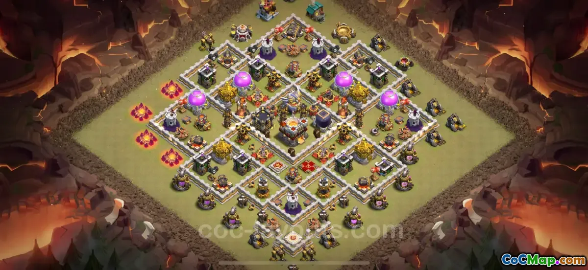Помимо конструктивных элементов базы, в проекте подчеркивается стратегическое расположение оборонительных построек. Ключевые оборонительные сооружения, такие как «Адские башни» и «Орлиные артиллерии», расположены так, чтобы прикрывать жизненно важные районы и создавать перекрывающиеся поля огня. Такое расположение помогает максимизировать их эффективность против войск или стад, наносящих большой урон, которые часто используются в стратегиях нападения на Ратушу 11.