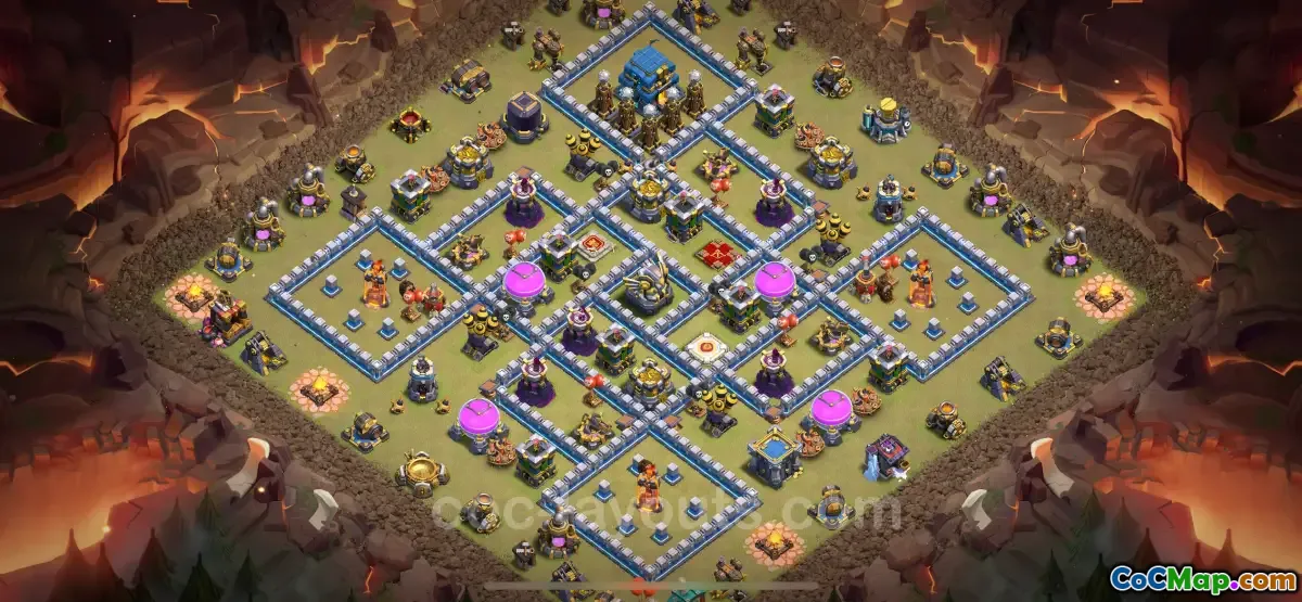 Эта анти-трехзвездочная база направлена на то, чтобы не дать противникам развернуть свои войска таким образом, чтобы они могли легко преодолеть вашу оборону. Стратегическое расположение защитных сооружений и ловушек помогает помешать распространенным стратегиям нападения, используемым в Ратуше 12. Используя комбинацию стен, защитных зданий и ловушек, игроки могут создать планировку, которая бросает вызов атакующим и заставляет их корректировать свой подход, тем самым увеличивая вероятность частичного провала их атак.