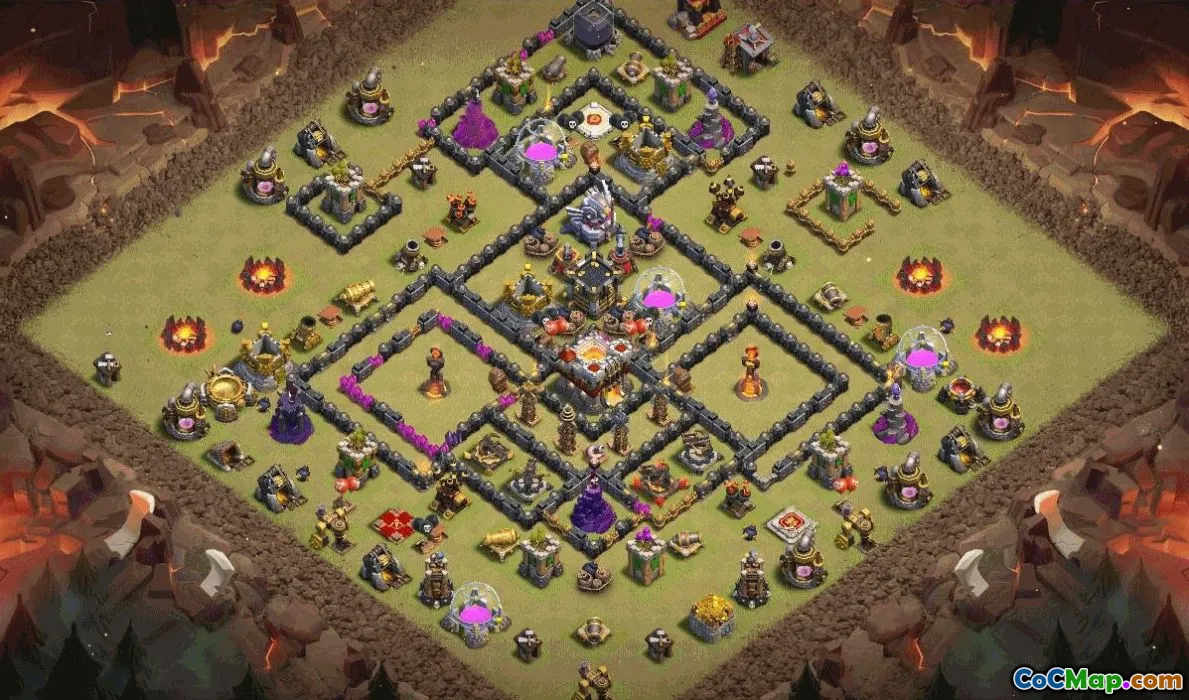 The layout options serve different purposes; some are tailored to protect trophies by preventing enemies from gaining easy stars, while others are designed to be competitive in clan wars by discouraging enemy troops from reaching critical defensive structures. The inclusion of a Clash of Clans map provides an overview of multiple base configurations, giving players a visual resource to compare and select layouts that fit their preferences or defensive needs.