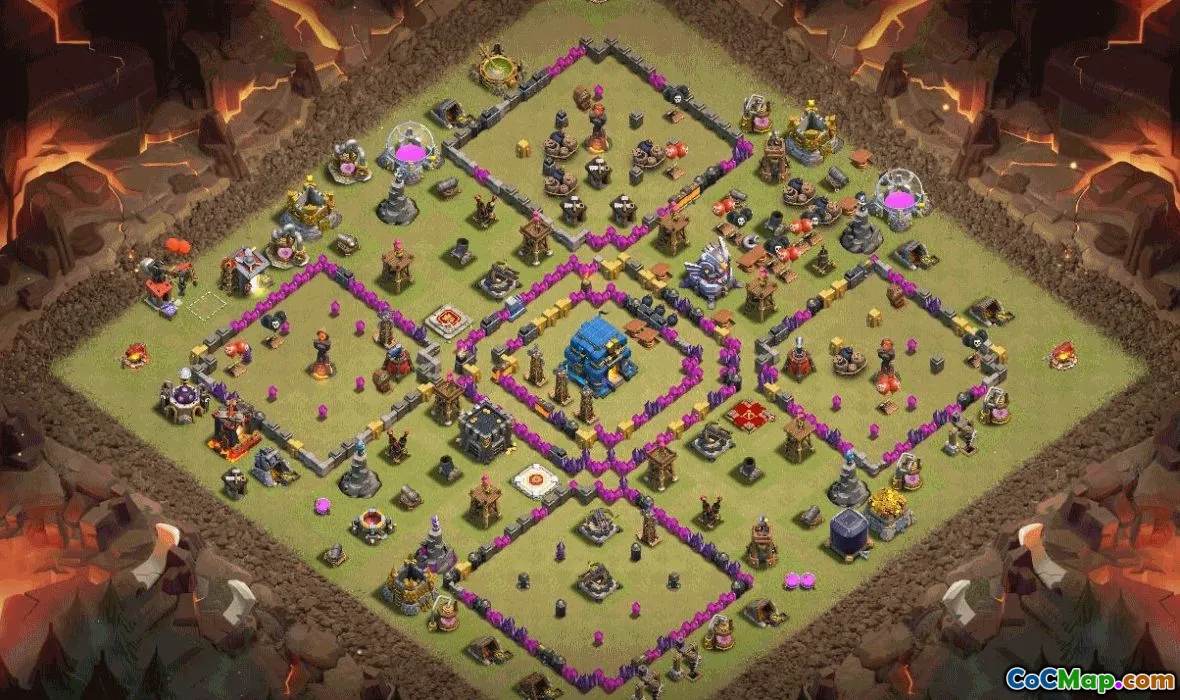 The layout options include maps designed to optimize defense against attackers in both friendly and clan wars. These maps are crafted to prevent enemies from easily accessing key resources like gold, elixir, and dark elixir, while also safeguarding the Town Hall. The designs incorporate strategic placement of walls, traps, and defensive buildings to maximize the overall strength of the base during attacks.