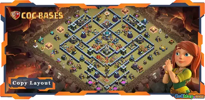 Этот базовый дизайн TH13 относится к категории «против 2 звезд» и «против всего», что делает его стратегическим макетом для игроков, стремящихся эффективно защищаться во время сражений. Расположение базы тщательно структурировано, чтобы не дать врагам достичь высоких звездных очков. Различные разделы макета предназначены для защиты жизненно важных ресурсов и самой Ратуши, что имеет решающее значение для успешной обороны.