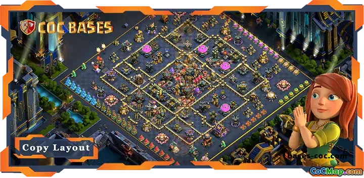 This top farming base for Town Hall 17 offers a well-balanced hybrid layout that prioritizes resource protection and overall defense. Its strategic placement of walls, defenses, and traps creates a resilient barrier against all attack types, making it ideal for farming efficiently.
