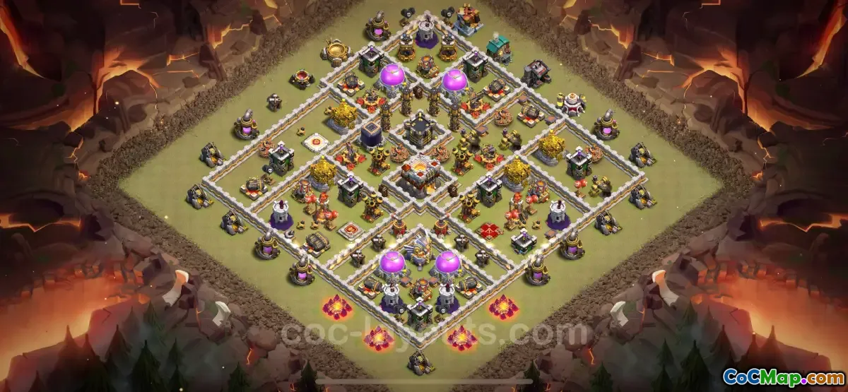 This anti-everything base features strategic placements of defensive structures and traps, creating a layout that is difficult for attackers to navigate. The design minimizes the chances of opponents successfully executing their plans, often leading them to misstep or waste their resources. By utilizing clever architectural features, such as compartmentalization and centralizing important structures like the Town Hall and Clan Castle, this base effectively disorients attackers and maximizes defensive potential.