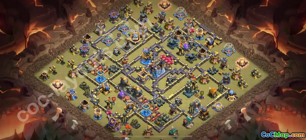This top-tier Anti 3 Stars War Base for TH18 is specifically designed to repel high-level attacks in CWL and Clan War events. Its strategic placement of defenses, including Inferno Towers, Eagle Artillery, and X-Bows, creates a robust barrier that confuses and traps attacking troops, making it extremely difficult for opponents to secure three stars.