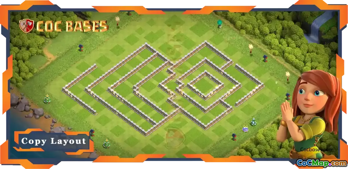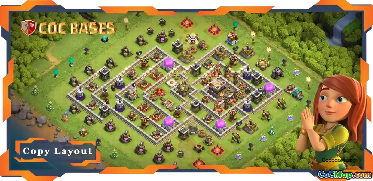 The highlighted layout employs a hybrid design, which means that it is suitable for both anti-trophy and loot protection. In this setup, the Town Hall is typically placed at the center of the base, surrounded by defensive structures, which effectively creates a challenging environment for opponents. The intention is to compel attackers to expend more troops and resources to reach the Town Hall, increasing the likelihood that they will either fail or be forced to leave without significant trophy gains.