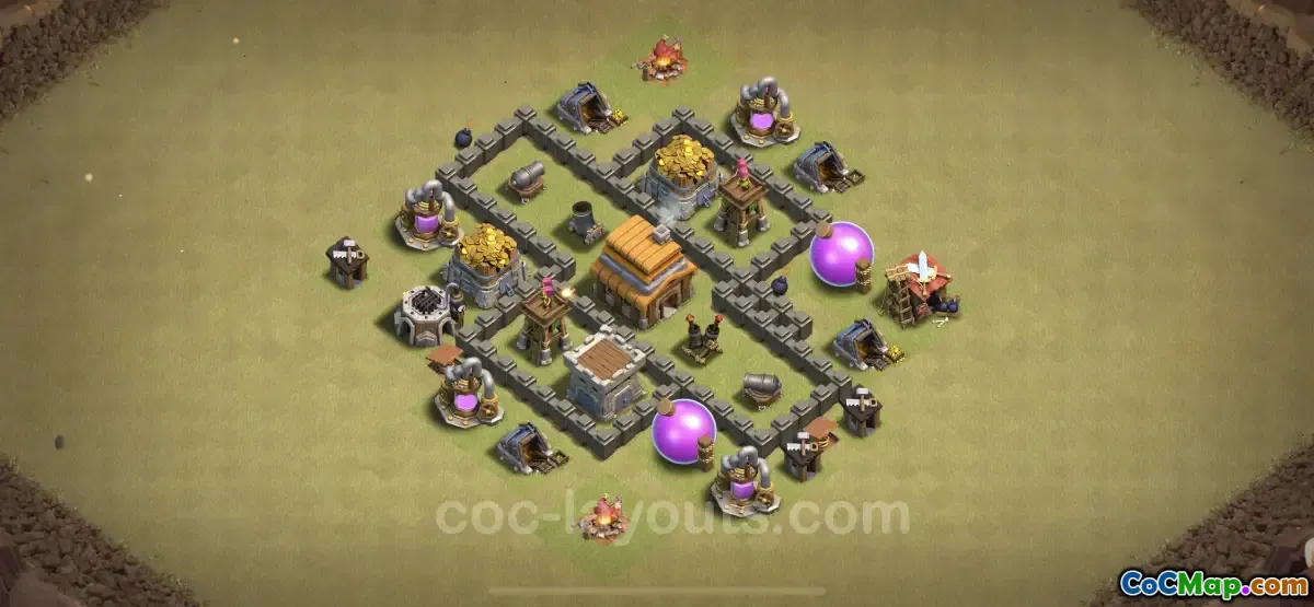 Denna TH4-bas betonar starka defensiva förmågor, särskilt mot luftattacker, som blir allt populärare bland spelare. Det genomtänkta arrangemanget av försvar säkerställer att luftenheter som ballonger eller drakar är mycket mottagliga för motangrepp. Dessutom inkluderar layouten välplacerade Archer Towers och kanoner som är avgörande för att upprätthålla luft- och markförsvar, vilket skapar en balanserad strategi för att skydda stadshuset.