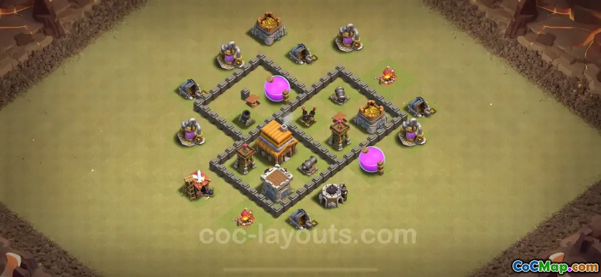 I denna speciella TH4-basdesign är en unik funktion att den syftar till att motverka många typer av attacker, vilket säkerställer att fiendens spelare möter utmaningar oavsett deras strategier. Layouten omfattar stadshuset centralt, omgivet av defensiva strukturer för att ge skydd i lager. Dessutom är defensiva byggnader placerade på ett sätt som tvingar angripare att sprida sina trupper tunt, vilket gör dem mottagliga för att bli överväldigade av strategiska fällor och försvar.