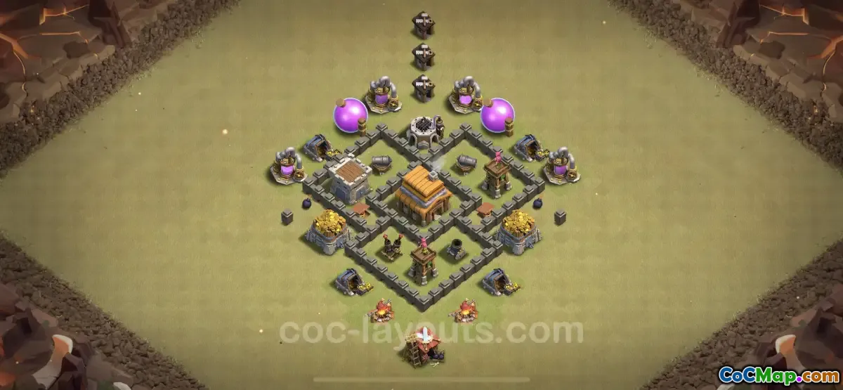 "Top Max Levels War TH4 Base" är designad speciellt för spelare i Clash of Clans (COC) som vill optimera sitt försvar under Clan War League (CWL) på Town Hall level 4. Denna basuppsättning är känd för sin omfattande strategi mot allt, vilket gör det till ett tillförlitligt val för spelare som vill skydda sina resurser och vinna i konkurrenskraftiga matcher.
