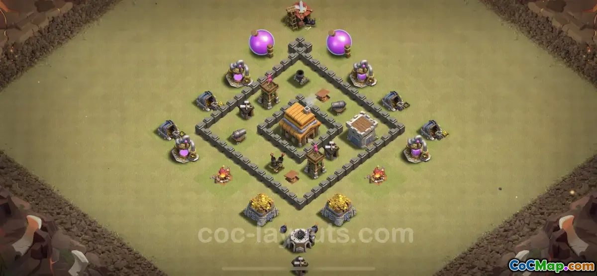 Baslayouten för Town Hall 4 innehåller ofta en mängd olika defensiva strukturer som kanoner, bågskyttetorn och murar som tjänar till att skapa barriärer och hindra fiendens truppers rörelse. Genom att skapa trattmekanismer kan designen styra angripare in i fällor eller områden med koncentrerad eld, och därigenom öka chanserna att motverka en attack. Denna strategiska placering är avgörande för att upprätthålla ett starkt försvar och uppmuntra fiender att sprida sina styrkor för tunt, vilket gör dem sårbara för motangrepp.