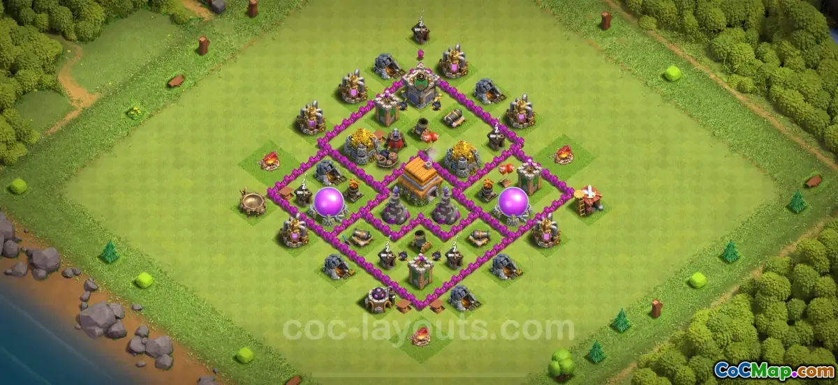 I artikeln tillhandahålls specifika baslayouter genom föreslagna länkar, som spelare kan använda för att visuellt inspirera sina egna försvar. Dessa layouter är designade för att motverka vanliga attackstrategier som finns i Town Hall 6, inklusive strategier som förlitar sig på masstrupper eller flyganfall. Spelare rekommenderas att ofta justera sina baslayouter baserat på att observera attackmönster, eftersom detta kommer att hjälpa till att upptäcka svaga punkter i deras försvar.
