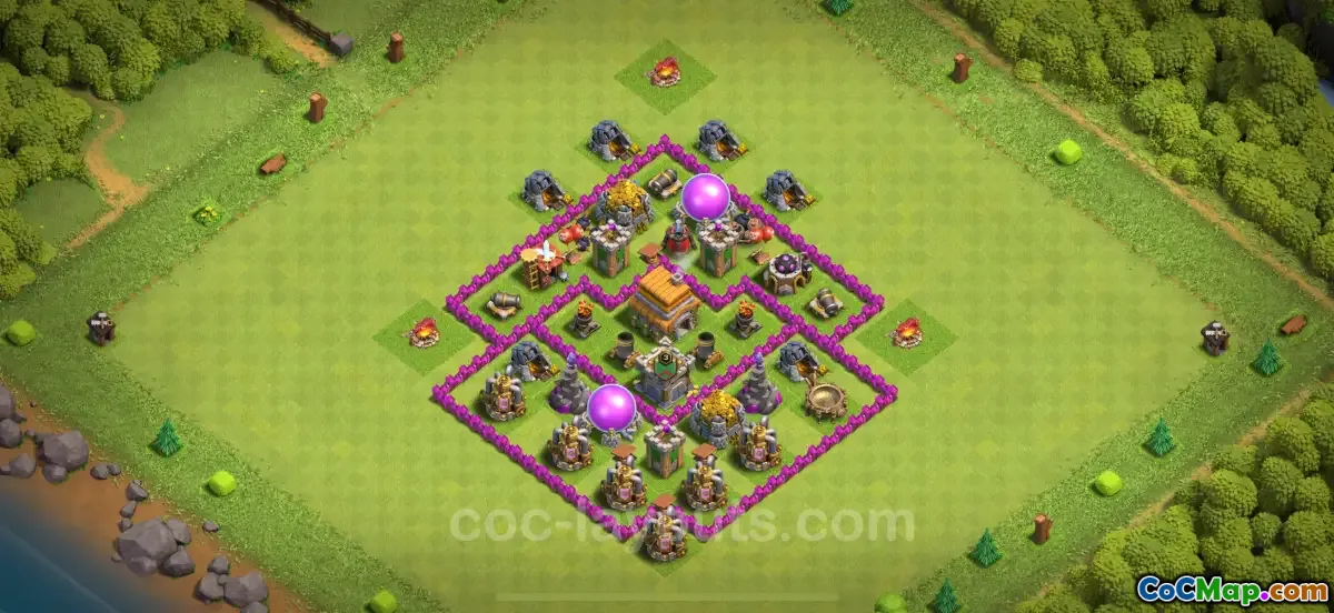 En typisk TH6 anti-trestjärnig bas har ett välplacerat rådhus, ofta beläget i kärnan av layouten. Denna placering gör det svårt för motståndare att helt enkelt placera ut sina trupper vid kanterna och säkra en enkel vinst. Dessutom är defensiva byggnader som kanoner, bågskyttetorn och mortlar arrangerade på ett sätt som täcker flera riktningar och skapar överlappande försvarszoner. Denna inställning säkerställer att angripare möter betydande motstånd från olika vinklar, vilket avsevärt minskar deras framgångsfrekvens.