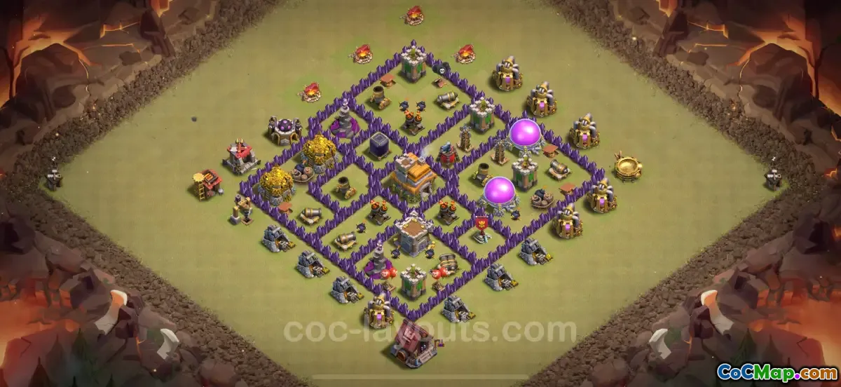 En hybridbasdesign för Town Hall 7 syftar till att skydda både elixir och guld, tillsammans med att upprätthålla ett starkt försvar mot stjärnprestationer. Detta dubbla syfte är avgörande eftersom spelare vill säkerställa att deras byte är säker samtidigt som de avskräcker angripare från att ta överhanden i deras troféräkning. Den idealiska basdesignen inkluderar strategiskt placerade försvar, tillsammans med användningen av väggar för att sektionera och säkra olika sektioner. Genom att använda en hybridlayout kan spelare optimera sina försvar för att täcka alla vinklar och kanter, vilket minimerar sårbarheter.