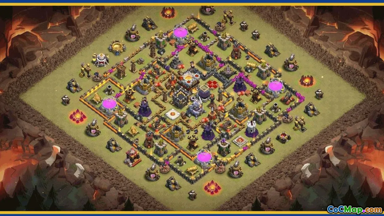 The home village layout focuses on balancing resource protection with defense, often employing walls, traps, and strategic placement of defenses such as cannons, archer towers, and air defenses. Trophy bases are designed to prevent losses and are often used by players aiming to maintain or increase their trophy count by discouraging enemy attacks through strategic deployment of defensive structures. War bases are optimized to protect clan troops during clan wars and typically feature centralized Town Halls and tightly packed defenses to minimize destruction.