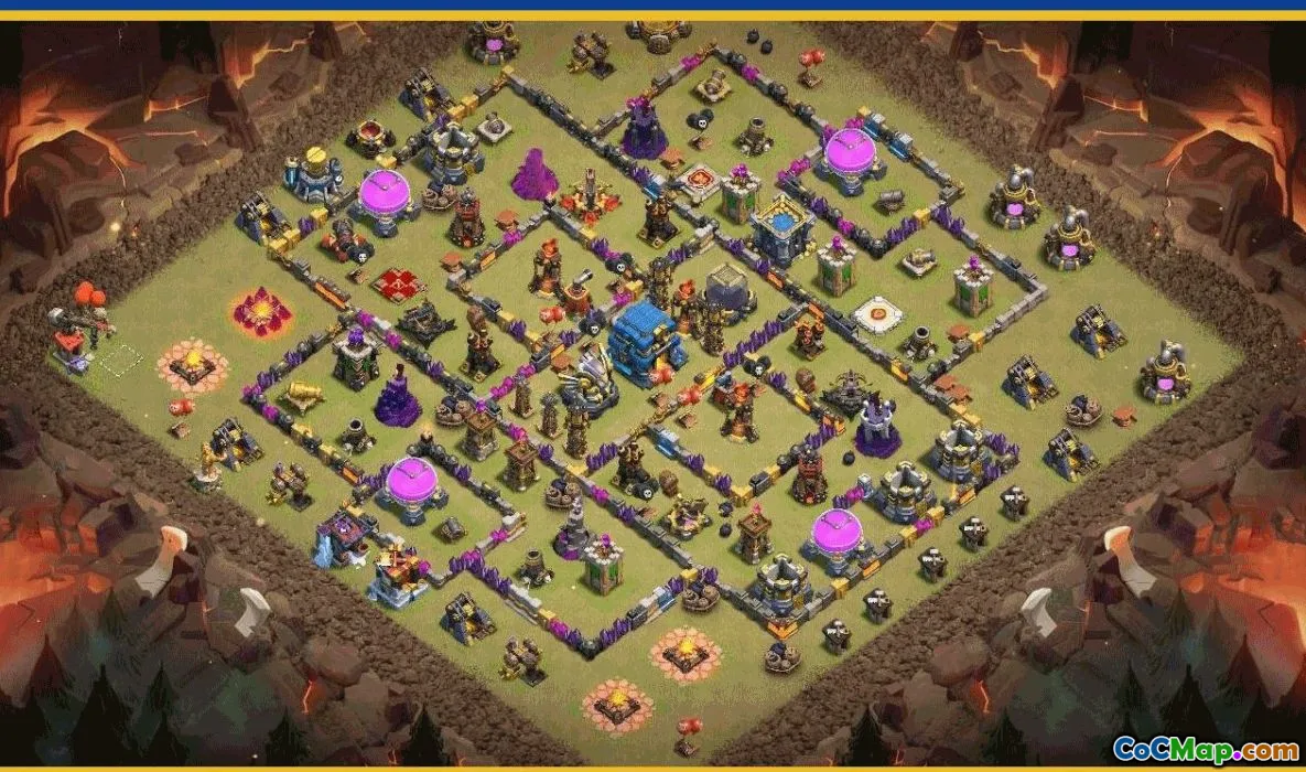 The base layouts highlighted include home village setups, farming bases, trophy bases, and general map configurations. Home village layouts are designed to defend against enemy attacks effectively. Farming bases focus on protecting resources by diverting attacks away from resource storages. Trophy bases are tailored to maximize defense against continuous farming and trophy loss, thus helping players climb the ranks while minimizing losses. The Clash of Clans map and layout options provide a comprehensive resource to build or upgrade bases to the desired standard.