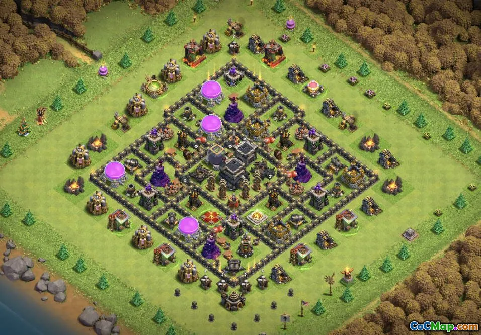 Under hela spelet har spelare tillgång till ett brett utbud av layouter och kartor som är specifikt skapade för rådhuset 9. Dessa layouter är utformade för att balansera försvar och lagring av resurser effektivt. Till exempel är en trofébaslayout vanligtvis optimerad för att motstå attacker och upprätthålla höga troféer genom att säkerställa att defensiva strukturer är strategiskt placerade för att täcka nyckelområden. Omvänt fokuserar en jordbruksbaslayout på att skydda värdefulla resurser, ofta genom att placera lagringar djupt i basen medan du använder väggar och försvar som hinder mot inkräktare.